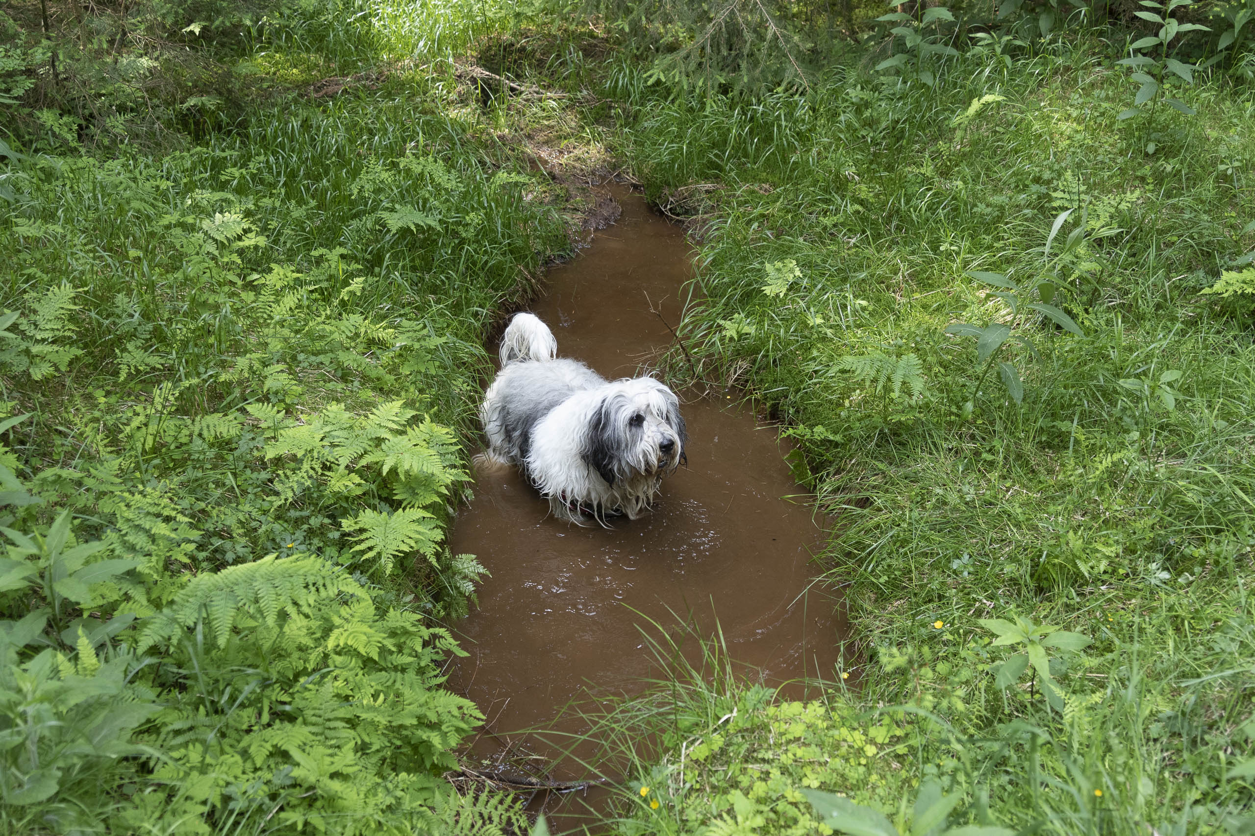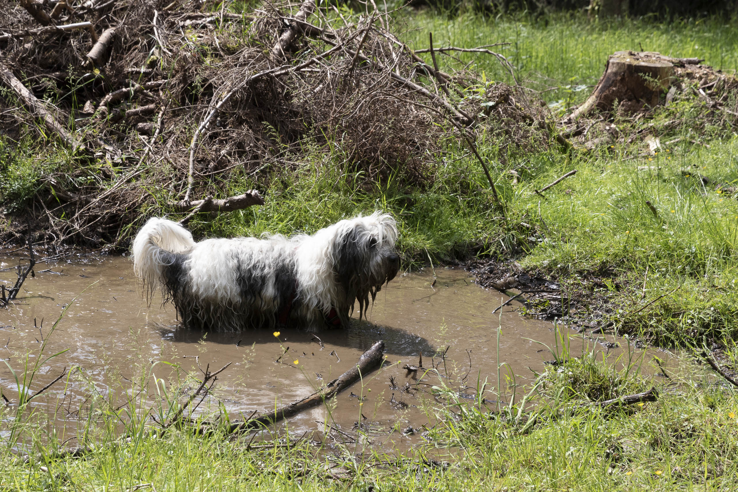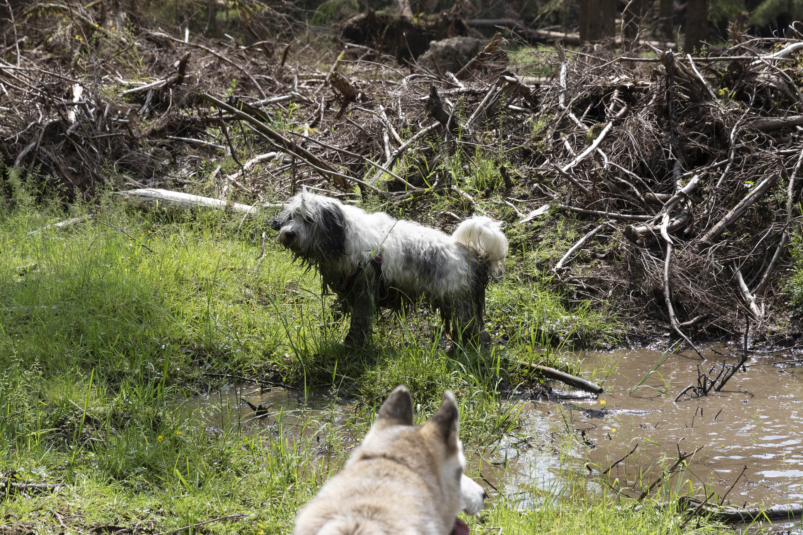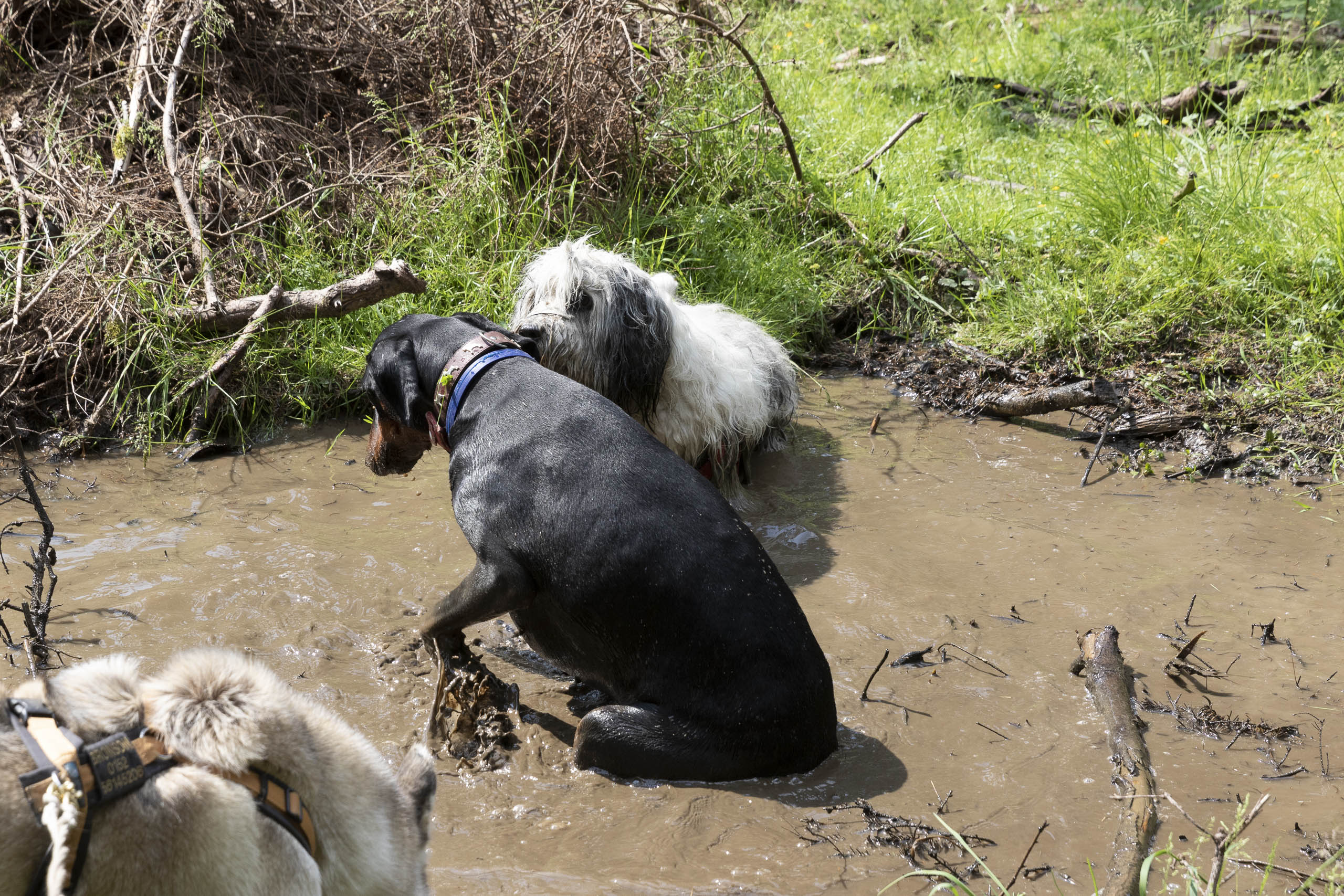 Am Samstag ging es dann um 10:00 Uhr am Sonneberg los – dort kamen Birte, Astrid und Silvia dazu, die frühmorgens aus Berlin gestartet waren. Mit acht Menschen und zehn Hunden (wir hatten uns noch Husky Hoku von Claudia „ausgeliehen“) ging es dann am Sonnenberg entlang zum Sonnenberger Flutgraben. Auf dem Weg lag das eine oder andere kleine Schlammloch – sehr zur Freude der Hunde.